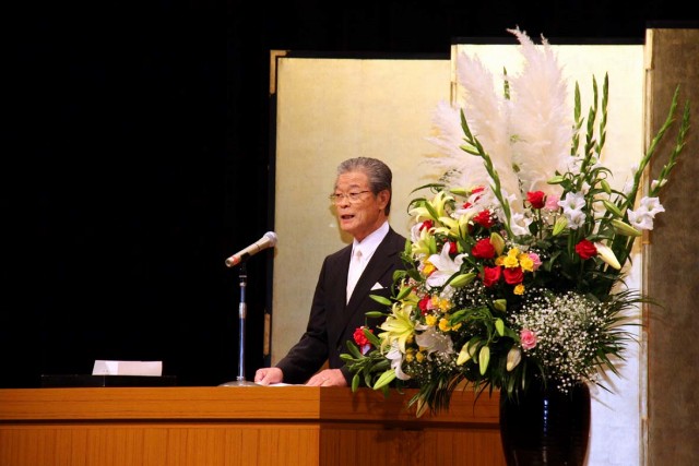 記念式典で挨拶する常盤正臣100周年実行委員長 |