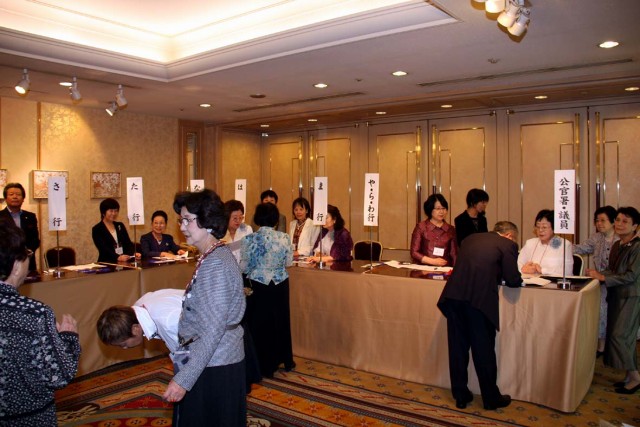 早くから来賓者で賑わう祝賀会会場の受付風景 |