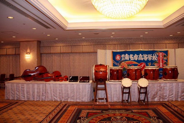 実行委員会から学校に寄贈の百年太鼓と吹奏楽器も展示 |