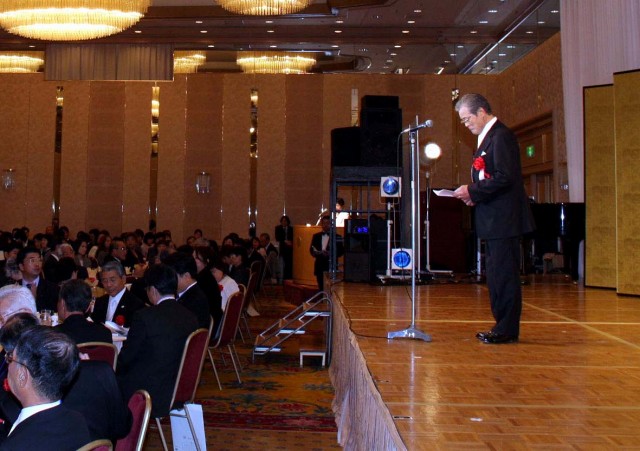 出席者を前に挨拶する常磐正臣100周年実行委員長 |