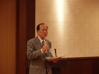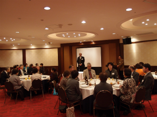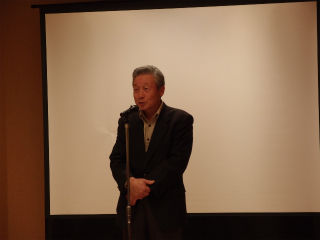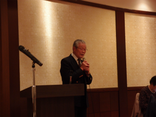 新年会であいさつをする石川会長 押尾名誉会長のあいさつ 押尾名誉会長のあいさつ 歳の初めを寿ぎながら歓談する参加者 母校に残っていた8ミリフィルムの説明に耳を傾ける参加者