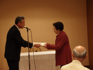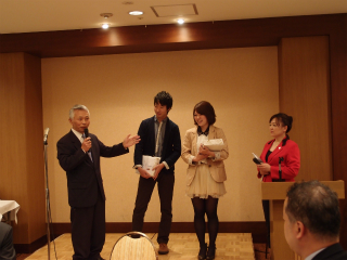 午後1時からの懇親会は、井上務会員(昭和44年卒)と演歌歌手・伊達めぐみさん(平成3年卒)の軽妙な司会が会場の雰囲気を和やかにしました。新入会員の代表として出席した島田大気君と鳥居真弥さんの大学1年生が紹介され、あかね会から2人に記念品が贈呈されました。司会者の突然の要請に応え、鳥居さんは英語とフランス語であいさつするなど、母校のレベルの高さの一端が垣間見られました。