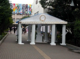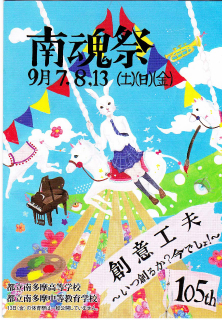 南多摩高校及び南多摩中等教育学校の合同文化祭・第105回『南魂祭』は、残暑がちょっぴり緩やかになった9月7日(土)・8日(日)に母校で開催されました。毎年、興味をそそられる正門のゲート、今年は真っ白な古代ギリシャ風の円柱ゲートで、中央にはサモトラケのニケ像を安置。そこを潜ると立て看板が並び、正面の校舎には多数の垂れ幕が目に入ってきます。