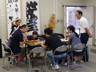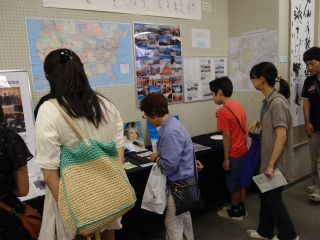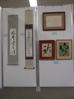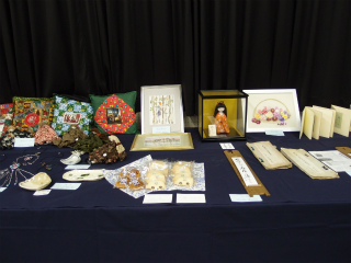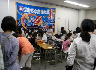 さて、南多摩高校同窓会【あかね会】では、西館入口すぐの視聴覚教室に展示ブースを設置しました。今年で4回目を数える同窓生の作品を一堂に陳列し、卒業生・同窓生約30人から出品された書道、絵画、写真、陶芸、アクセサリー、バッグ、能面、人形、織物、盆栽、生け花、音楽CD、著作出版物など約100点以上が出展されました。アメリカ大陸を車で横断した福島雪男さん(昭和35年卒)は、パソコンを持ち込んで来場者に自ら動画を見せて解説をしていたのが印象的でした。今年は中等生の実習用に、展示会場の一部をPTA主催のミサンガ教室に活用し、隣会場のPTAとの交流を一層充実させました。また、生徒のために「あかね会クイズ」を開催、景品のお菓子を求めて中等生、高校生、さらには未来の中等生も訪れ、賑わいを見せました。