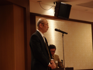 新年会であいさつをする石川会長 押尾名誉会長のあいさつ 押尾名誉会長のあいさつ 歳の初めを寿ぎながら歓談する参加者 母校に残っていた8ミリフィルムの説明に耳を傾ける参加者