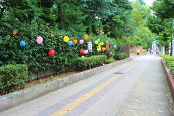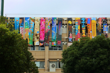 ![]() 校門に向かう歩道脇に飾られた南魂祭の案内 ![]() 正門正面に設置されたゲート ![]() 校舎に掲げられたクラスごとの幟も引き継がれた |