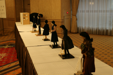 ![]() 祝賀会会場入口に並んだ歴代制服の人形 |