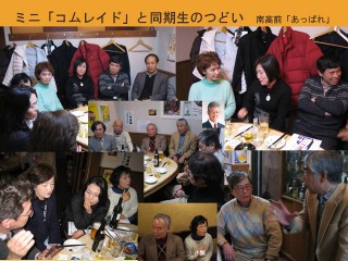 2月12日、南高前のパワーキッチン「あっぱれ」で、ミニ・クラス会を開催しました。 恩師・相沢健夫先生(英語)にもお越し頂き、他クラス生を含めた級友16人がにわかに集い、ほぼ5年ぶりに旧交を温めました。 すぐに45年前に戻る仲間です。ベーさん、ミヤコ、めぐちゃん、コセ、浜チュー、もうさんと懐かしい呼称です。誰かが「60歳は洟垂れ小僧」と言っていましたが、みんな元気な連中です。当日の様子は、添付の写真を見てください。 思わず17歳の頃のことが浮かんできました。