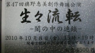 舞踊家、旗野恵美さん(昭和26年卒)が来る10月8日に47回目となる創作舞踊公演を行います。 公演会場は草月ホール(港区赤坂、03−3408−1129)。 テーマは「生々流転 −闇の中の連鎖ー」です。 開演時刻は15時と19時の2回(開場は開演30分前)。 (前売4500円、当日5000円)。 旗野さんは創立100周年記念誌「湧水万古」(P240〜)に「出会いと思い出」と題した一文を寄せられました。 そこには母校第四で舞踊と出合った当時の思い出が綴られています。 ニューヨーク・デビュー以来国内外で数多くの公演を重ねられて来られました。 今回は東京での公演です。 同窓の皆さんが会場に足を運ばれることを期待してお知らせします。