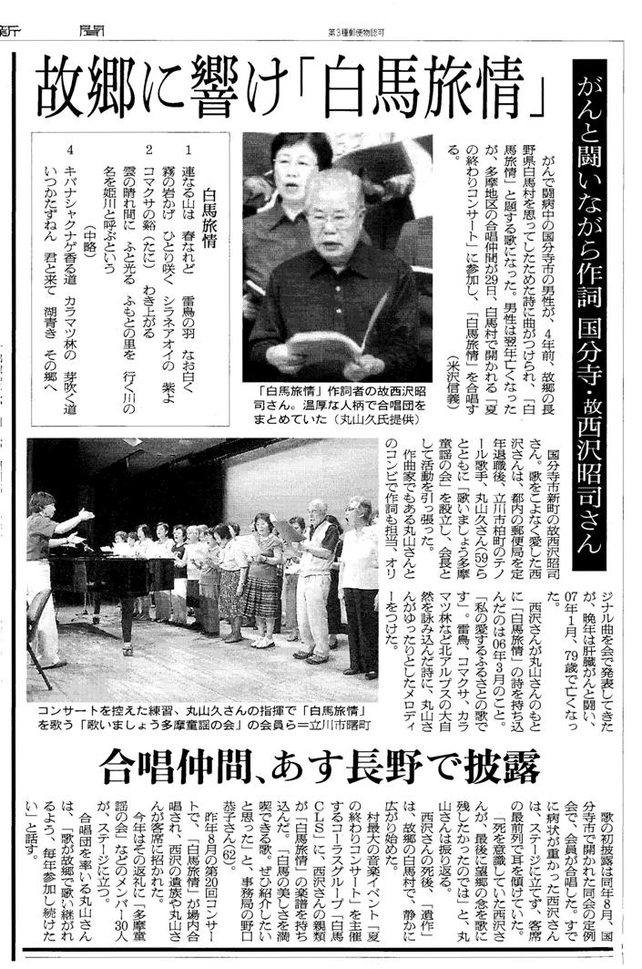 「白馬旅情」は、白馬村出身の故西沢昭司さん(多摩童謡の会の設立者で元会長)が平成19年1月に亡くなる前年に故郷を偲び作詞し、丸山さんが作曲したオリジナル曲。 西沢さんの遺族が地元のコーラスグループで「夏の終わりコンサート」を主催する「白馬CSL」に紹介したしたのがきっかけで、地元白馬村に広がり始めているという。