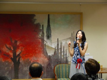 大絵画の前でトークする宮下真理子さん