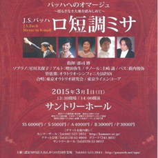 | 【演奏】 バッハへのオマージュ 〜揺るぎなき大地を踏みしめて〜 J.S.バッハ 『ロ短調ミサ』 指揮:郡司 博 ソプラノ:星川美保子、アルト:増田弥生、テノール:土崎譲、バス:藪内俊也 管弦楽:オラトリオ・シンフォニカJAPAN 合唱:東京オラトリオ研究会、東京ライエンコーア |