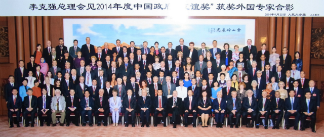 授与式では、馬凱副総裁からメタルと盾が授与され、30日には人民大会堂で李克強首相から「中国がここまで大きく発展できたのは皆様のような外国人専門家の功労です。」とスピーチがあり、集合写真を撮影しました。30日の夜は、18時から大会堂内の大ホールで政府成立65周年を祝う晩餐会があり、友誼賞受賞者と配偶者が招待されました。晩餐会は、李克強首相の進行で習近平主席のスピーチと乾杯の音頭で始まり、前リーダーの胡錦濤、温家宝、江沢民氏等も出席していました。 これぞ中国の最高のイベント人物の会でした。会場が大きすぎましたが、この席に同席できたことは感無量でした。